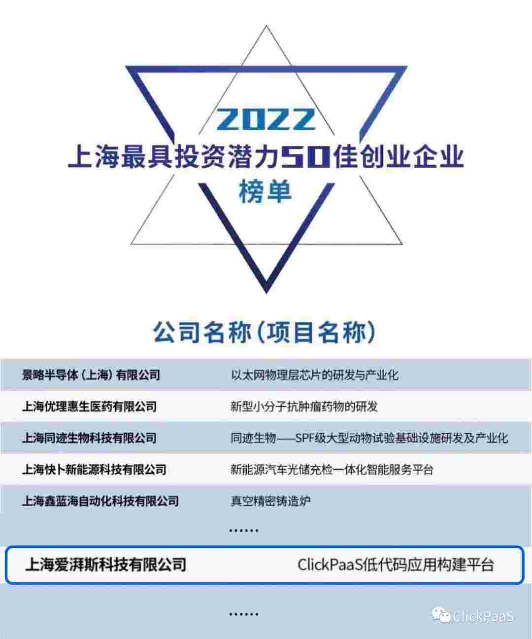 GOPAY钱包 作为国内低代码PaaS平台的领军企业,,与120家创企入围角逐。。。期间接受了来自德同资本、、、领中资本等知名投资机构的10位投资人组成专家评委团的背靠背盲选。。。。并最终入围“2022上海最具投资潜力50佳创业企业”榜单,,,被列入“上海市重点培育创业企业库”。。