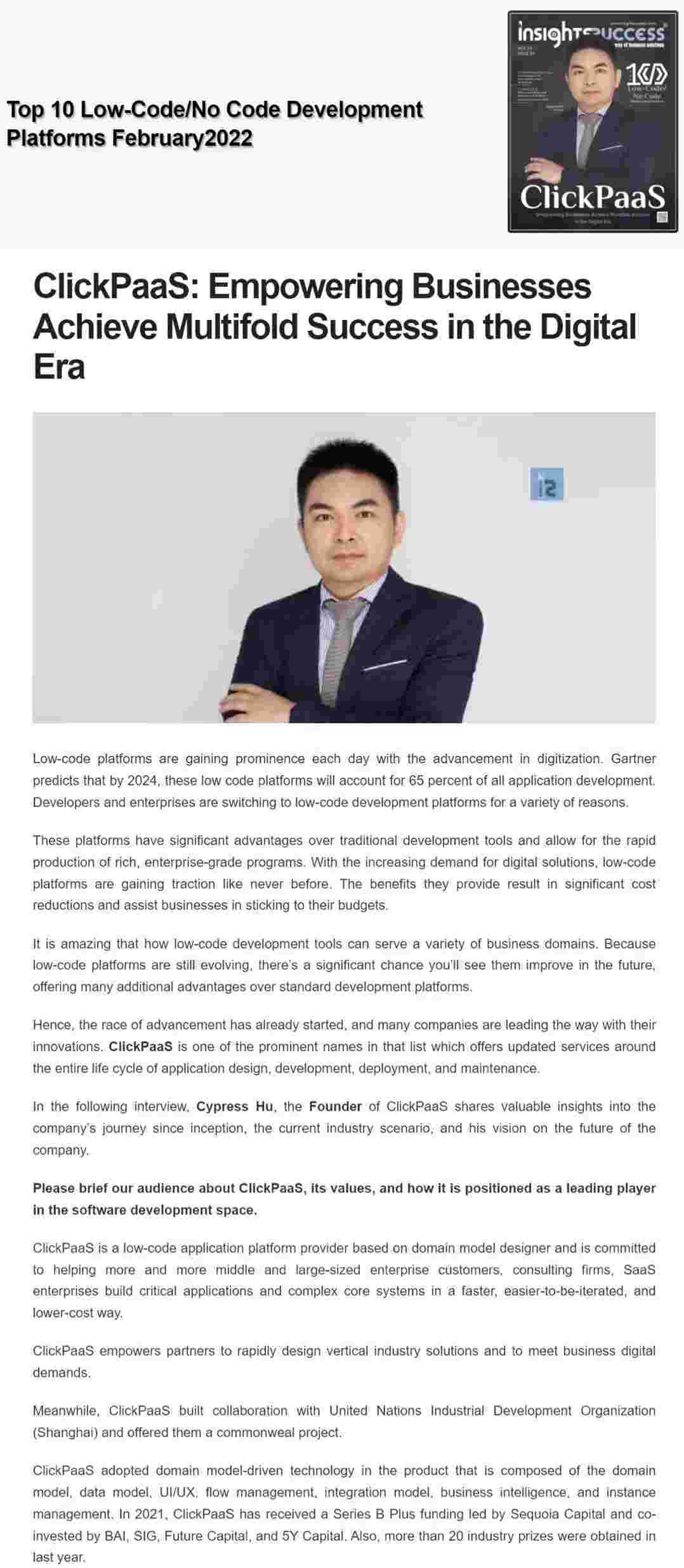 2022年年初,,GOPAY钱包入选外媒Insights Success低代码/无代码开发平台 Top10,,创始人、、CEO胡柏受邀接受专访并荣登封面人物,,,他与Insights Success的读者分享了GOPAY钱包成立的初心、、、、发展历程、、、当前的行业发展趋势以及他对公司未来的展望。。